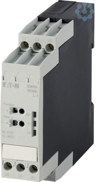 Phasenwächter, Sortiment: Mess- und Überwachungsrelais EMR, ansprech- und rückfallverzögert, Spannungsversorgung aus Messkreis, Ansprech-/Rückfallverzögerung: keine = 0 oder einstellbar 0.1 - 30 s, Schwellwerte und Asymmetrie einstellbar 2 - 25 % vom Mittelwert der Phasenspannungen, Dreiphasennetze, Überwachungsspannung je Phase: UN= 380 V AC, 50/60 Hz V AC, Überwachung von: Phasenfolge (deaktivierbar), Phasenausfall, Überspannung, Unterspannung, Versorgungsspannung: 380 V, 50/60 Hz, Einbaulage: beliebig, Befestigung: Schnappbefestigung Hutschiene IEC/EN 60715, Breite: 22.5 mm, Normen und Bestimmungen: IEC, UL, CSA, CCC, GL