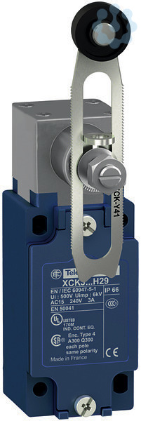 Positionsschalter OsiSense XCKJ. Schaltkontakte 1S+1Ö mit Sprungfunktion, 1 Kabeleinführung für Pg 13,5 Kabelverschraubung. Zamak Metallgehäuse, Form A entspricht CENELEC EN 50041, IP66, IK07. Rollenhebel Kunststoffrolle, Federrückstellung (Längenverstellbar), Seitliche Anfahrrichtung 1 oder 2 programmierbare Richtungen.