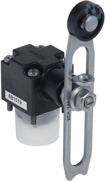 Antriebe für Hilfsschaltergehäuse ZCK S. ZCKD-Positionsschalterkopf, Längenverstellbarer Rollenhebel mit Kunststoffrolle. Für geradlinige Betätigung und für Drehachsen-Betätigung.