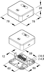 Potentialausgleichsschiene in AP-Dose, mit Deckel, mit 7 ausbrechbaren Kabeleinführungen ( 4 x Ø 17 x 19,5, 3 x Ø 19,5 x 22 mm ), halogenfrei. Abmessungen (ca. Maße) H x B x L : 28 x 78 x 78 mm Anschlussmöglichkeiten