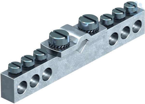 Potentialausgleichsschiene Anschlussmöglichkeiten: - 6 x Leitungen 1,5-10 mm² - 1 x Leitung 6-16 mm² - Ungeschnitten - Kontaktleiste aus Messing, vernickelt - Schrauben und Klemmbügel aus Stahl, galvanisch verzinkt Gewicht: 2,963 kg/100 St. Typ: 1804 Art.-Nr.: 5015553