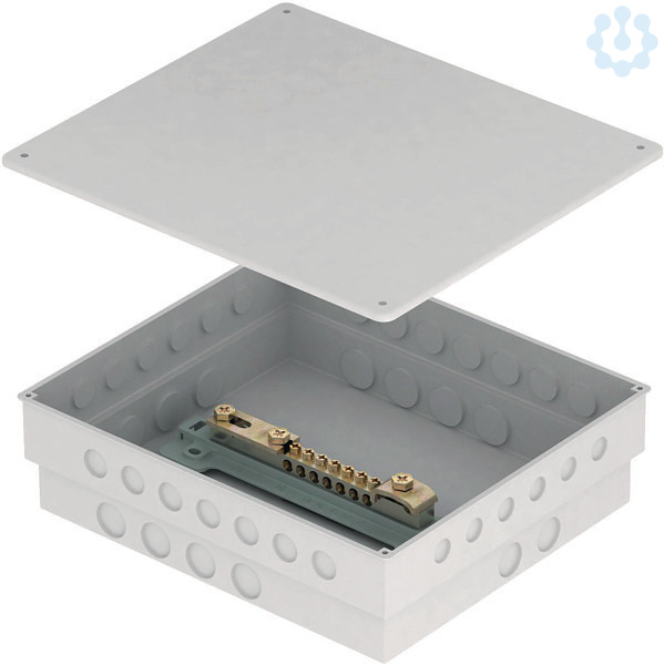 Potentialausgleichsschiene mit montierter Potentialausgleichsschiene 1809 (ohne Abdeckhaube). Kasten mit Vorprägung zum Einführen der erforderlichen Leitungen und Deckel. Anschlussmöglichkeiten: 7 x Leitungen bis 25 mm², 1 x Rundleiter Rd 8-10, 1 x Flachleiter bis FL30 oder Rundleiter Rd 8-10.