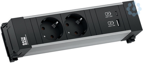 Power Frame Steckdosenleiste Small ALU 2xSchutzkontaksteckdosen schwarz mit erhöhtem Berührungsschutz 1xUSB A&C 22W Charger Stromeingang 0,2m H05VV-F3G1,5mm² mit GST18 Stecker. Zuleitung durch Endkappe Bedruckung Bachmann. Verpackung im Karton