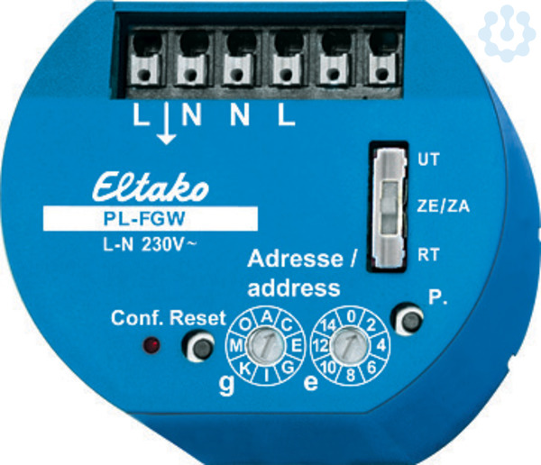 Bidirektional. 53x43mm, 40mm tief, für Montage in 58mm Schalterdosen. Stand-by-Verlust 1,1 Watt. Versorgungsspannung 230V. Leistungsaufnahme im Betrieb 1,1 Watt. In das Gateway eingelernte Powerline-Telegramme aus dem Stromnetz werden automatisch in Eltako-Funktelegramme übersetzt und gesendet. In das Gateway eingelernte Funk-Telegramme werden in Powerline-Telegramme übersetzt und auf das Stromnetz moduliert. Durch Drücken des Reset-Tasters wird das PL-FGW in den Lernmodus versetzt. Über die Drehschalter wird dabei ausgewählt, ob Funk- oder Powerline-Telegramme eingelernt werden sollen. Einem einzulernenden Powerline-Sensor wird durch Betätigung im Lernmodus automatisch ein freier Funkkanal zugeordnet. Es können bis zu 80 Powerline-Sensoren oder Rückmeldungen eingelernt werden. Einem einzulernendem Funk-Sensor wird über den Schiebeschalter des PL-FGW die Funktion als Universal-, Richtungs- oder Zentraltaster zugeordnet. Über die Drehschalter g und e wird die Powerline-Adresse eingestellt, die der Funksensor k