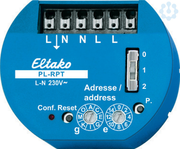 Powerline-Repeater. 53x43mm, 25mm tief, für Montage in 58mm-Schalterdosen. Stand-by-Verlust nur 0,5 Watt. Mit dem Repeater können größere Reichweiten erzielt werden. Bei Kabellängen >300m wird der Repeater typischerweise in einer Verteilung zwischen dem Sensor und Aktor plaziert. Der Repeater wiederholt Kommandos von Sensoren mit der gleichen Adresse g, e. Rückmeldungen der Aktoren werden nicht wiederholt. Für die Adresszuweisung befinden sich auf der Vorderseite zwei Drehschalter: Der linke Drehschalter bestimmt die Gruppenadresse g mit 16 alphabetischen Werten von A bis P. Der rechte Drehschalter bestimmt die Elementaradresse e mit 16 numerischen Werten. Oberhalb davon befindet sich ein Schiebeschalter als Konfigurationsschalter mit den Stellungen 0, 1 und 2. Stellung 0: Zentralbefehle werden wiederholt, umabhängig von der Adresse e des Repeaters. Bei Adresse g, e = 0 werden nur Zentralkommandos wiederholt. Stellung 1: Bei Adresse g, e = 0 am Repeater werden alle Kommandos der Gruppe g wiederholt. Stellung