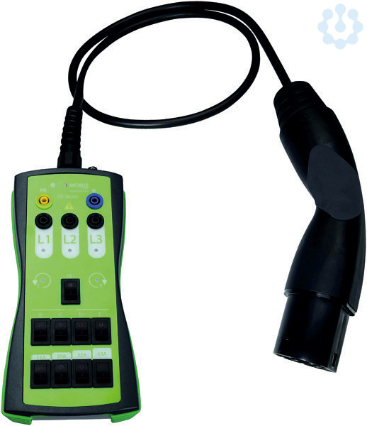 des maximalen Ladestromes. - Überprüfung der PE-Verbindung zwischen PWM und Fahrzeugstecker - Simulation der Fahrzeugzustände - Anzeige PWM-Signal(BNC Messbuchse CP) - Phasenanzeige L1, L2, L3 - Drehfeldanzeige - Prüfbuchsen (Simulation externer Fehlerströme) Ausstattung: - Abmessung: HxBxT 205x105x40 mm - Kunststoffgehäuse mit seitlicher Gummierung - Stecker: Ladestecker Typ 2 mit 1m Anschlussleitung - Farbe: grün-schwarz