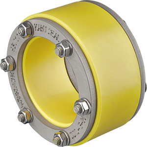 Kabu-Seal ist eine Pressringdichtung aus einem Vollgummikern (EPDM) mit weicher Duroplast-Elastomer (PUR) Umhüllung in gelb und Pressflanschen aus Edelstahl.Verwendet wird diese druckwasserdichte Mauereinführung für Kabuflex® Rohre bei Haus und Mauereinführungen. Der Vorteil besteht in der weichen Oberfläche, wodurch eine Abdichtung gegenüber dem Kabelschutzrohr und der Kernbohrung bis zu 1,5 bar Wasserdruck entsteht.Aufgrund der sehr guten Hafteigenschaft sitzt der Kabu-Seal Pressring-Dichteinsatz, bereits bei sehr geringem Anzugsmoment (2 Nm) der Schraubverbindung, sicher (gegen drückendes Wasser und Gas) im Ringraum. Der Einbau kann ohne Sonderwerkzeug (Drehmomentschlüssel) erfolgreich über Sichtkontaktanzeige (gelber Wulst) an den Pressflanschrändern durchgeführt werden.