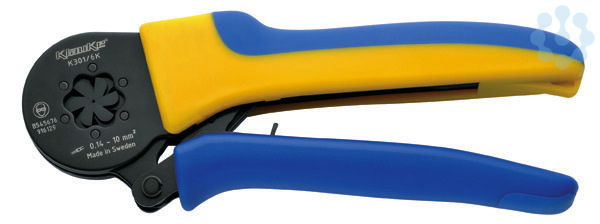 Presswerkzeug für Aderendhülsen und Zwillingsaderendhülsen 0,14 - 10 mm², Sechskantpressung, sehr leicht und ergonomisch, ein Pressprofil für alle Qürschnitte durch automatische Qürschnittanpassung, mit Sperrvorrichtung für gleichmäßig kontrollierte Pressergebnisse, seitliche Hülseneinführung (Seitenpressung), Handgriffe mit Abgleitschutz und Beschriftungsfeld, Sicherheitspad im Griff für abrutschsicheres Arbeiten