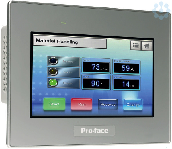 Pro-face ST6000E Basic Touch-Panel für einfache Maschinen, programmiert mit der Software GP-Pro EX. Diese Produkt-Reihe wurde entwickelt, um die Anforderungen an die Bedienerschnittstelle einfacher Maschinen zu erfüllen. Hierbei steht die Kompatibilität der Software auf einer modernen Hardware im Mittelpunkt. Das resistive Single-Touch Display in 7 Zoll wide screen mit 16 Mio Farben und einer Auflösung von 800x480 Pixel dient der Visualisierung, Bedienung und Statusanzeige ihrer Anwendungen. Die Bedienoberfläche auf dem HMI wird mit der Software GP-Pro EX konfiguriert. Durch die vielfältigen Schnittstellen (2 x Ethernet (dual IP), 2 x serielle COM, 1 x USB Typ A, 1 x USB micro-B) ist eine optimale Konnektivität gewährleistet. Die äußeren Abmessungen des Displays betragen 208 mm (Breite) x 153 mm (Höhe) x 45 mm (Tiefe) bei einem Panel Cut-out von 190 mm x 135 mm und einer Tafeldicke von 1,6 bis 5 mm. Das Produkt entspricht der Schutzklasse IP65F, Typ 1, Typ 4X (nur für den Innenbereich), Typ 12 und Typ 13 (bei