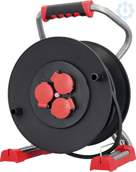 Profi-Kabeltrommel Trommelkörper aus robustem, hochbruchfestem Spezialkunststoff 3xSchutzkontaktsteckdosen inkl. Klappdeckel IP44 25,0m Gummischlauchleitung H07RN-F 3G 1,5mm² mit Schutzkontaktstecker CEE7/7 Stabiles, stoßdämpfendes Profi-Doppelrohrgestell mit Sterngriffbremse Ergonomischer, rutschfester 2-Komponentengriff Integrierte Leitungsführung Inklusive Thermoschutzschalter Für die Verwendung im Freien und auf Baustellen Verpackt im Karton
