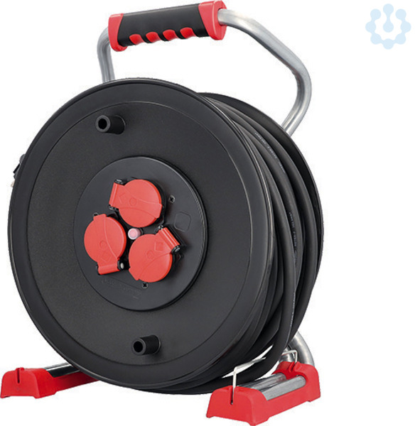 Profi-Kabeltrommel Trommelkörper aus robustem, hochbruchfestem Spezialkunststoff 3xSchutzkontaktsteckdosen inkl. Klappdeckel IP44 40,0m Gummischlauchleitung H07RN-F 3G 2,5mm² mit Schutzkontaktstecker CEE7/7 Stabiles, stoßdämpfendes Profi-Doppelrohrgestell mit Sterngriffbremse Ergonomischer, rutschfester 2-Komponentengriff Integrierte Leitungsführung Inklusive Thermoschutzschalter Für die Verwendung im Freien und auf Baustellen Verpackt im Karton
