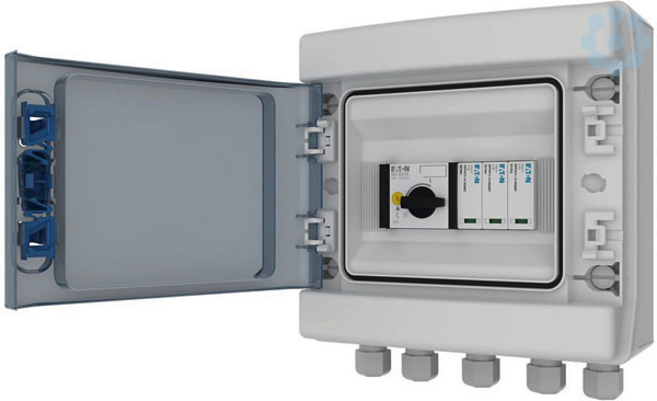 Photovoltaik-DC-Stringbox, werkseitig von Eaton montiert: IEC 61439-2 Anhang-DD. Für Wechselrichter mit 1 MPP-Tracker: 1x IN + 1x OUT, integrierte Geräte: PKZ-SOL PV-Strangschutzschalter und PV-Überspannungsschutzgerät Typ 2, Kabelverschraubungen für direkte Verbindung zu den Geräten, IKA-Box 1-reihig mit 8 Teilungseinheiten und Klarsichtfenster, nur für die Innenraumaufstellung. Für einen sicheren Betrieb beachten Sie bitte die min. und max. zulässige Umgebungslufttemperatur im technischen Datenblatt