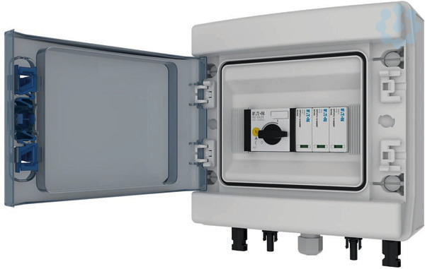 Photovoltaik-DC-Stringbox, werkseitig von Eaton montiert: IEC 61439-2 Anhang-DD. Für Wechselrichter mit 1 MPP-Tracker: 1x IN + 1x OUT, integrierte Geräte: PKZ-SOL PV-Strangschutzschalter und PV-Überspannungsschutzgerät Typ 2, MC4-Anschlüsse an der Unterseite der Box, IKA-Box 1-reihig mit 8 Teilungseinheiten und Klarsichtfenster, nur für die Innenraumaufstellung. Für einen sicheren Betrieb beachten Sie bitte die min. und max. zulässige Umgebungslufttemperatur im technischen Datenblatt