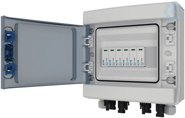 Photovoltaik-DC-Stringbox, werkseitig von Eaton montiert: IEC 61439-2 Anhang-DD. Für Wechselrichter mit 2 MPP-Trackern: 2x IN + 2x OUT, integrierte Geräte: PV-Überspannungsschutzgerät Typ 2, MC4-Anschlüsse an der Unterseite der Box, IKA-Box 1-reihig mit 8 Teilungseinheiten und Klarsichtfenster, für Freiluftaufstellung ohne direkte Sonnenlichteinwirkung. Für einen sicheren Betrieb beachten Sie bitte die min. und max. zulässige Umgebungslufttemperatur im technischen Datenblatt