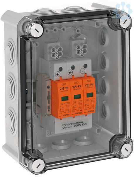 Systemlösung für den Blitzstrom- und Überspannungsschutz von PV-Wechselrichtern mit 2 separaten Eingängen (MPP-Tracker) anschlussfertig im Gehäuse vormontiert. Die Ableiter mit fehlerresistenter Y-Schaltung mit 3 Varistoren zum Einsatz nach VDE 0100-712, steckbar mit dynamischer Abtrennvorrichtung und optischer Funktionsanzeige zeichnen sich durch einen niedrigen DC-Schutzpegel < 3,0 kV aus. Das Gehäuse inklusive Kabelverschraubungsset, mit Schutzart IP66, aus Polycarbonat ist UV-beständig und für den Außeneinsatz geeignet. Pro Schutzgerät sind bereits 3 Klemmstellen bis 16 mm² vorinstalliert. Der einfache, schnelle und sichere Anschluss der DC-Kabel über die Durchgangs-Reihenklemmen ermöglicht einen optimalen Schutz vor dem elektrischen Wechselrichter. Die Schutzgeräte sind gemäß der maximalen Summen-Leerlaufspannung (Uoc) des PV-String auszuwählen. Bei Gefahr von Kondenswasserbildung durch Wind, Eis, Temperatur oder Sonne sind ggf. zusätzliche Maßnahmen erforderlich!