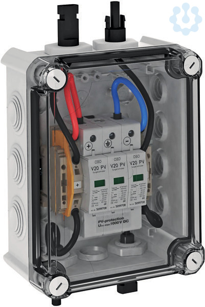 Systemlösung Typ 2 mit MC4-Stecker für PV-Wechselrichter mit 1 MPP-Tracker - Varistor-Ableiter, steckbar mit Abtrennvorrichtung in fehlerresistenter Y-Schaltung nach VDE 0100-712 (50539-12) - niedriger DC-Schutzpegel: < 4,0 kV (Uoc max = 1000V DC mit V20-C/0-500PV) - ein PV-String-Eingang (MC4-Steckverbinder) auf einen MPP-WR-Eingang, bis 30A DC pro Klemme - vormontiert im Polycarbonat Gehäuse (IP66), UV-beständig für den Außeneinsatz Zum DC-Schutz des Wechselrichters von PV-Anlagen. Bei Gefahr von Kondenswasserbildung durch Wind, Eis, Temperatur oder Sonne sind ggf. zusätzliche Maßnahmen erforderlich!