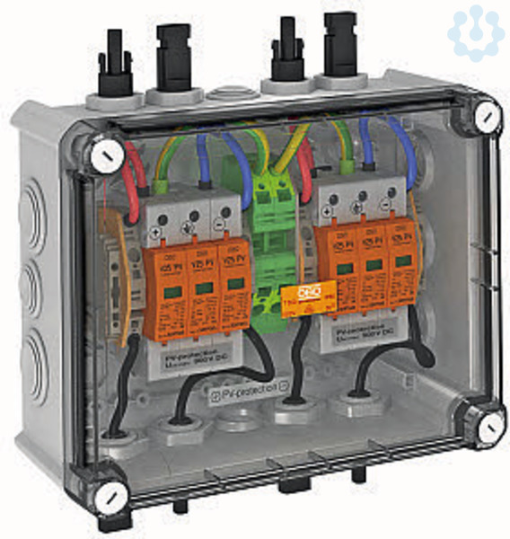 Systemlösung Typ 1+2 mit MC4-Stecker für PV-Wechselrichter mit 2 separaten MPP-Trackern - Varistor-Ableiter, steckbar mit Abtrennvorrichtung in fehlerresistenter Y-Schaltung nach VDE 0100-712 (50539-12) - Typ 1+2 Kombiableiter zum Blitzschutzpotentialausgleich nach EN 62305 (VDE 0185-305) - niedriger DC-Schutzpegel: < 3,0 kV (Uoc max = 900V DC mit V25-B+C/0-450PV) - ein PV-String-Eingang (MC4-Steckverbinder) auf einen MPP-WR-Eingang, bis 30A DC pro Klemme - vormontiert im Polycarbonat Gehäuse (IP66), UV-beständig für den Außeneinsatz Zum DC-Schutz des Wechselrichters von PV-Anlagen. Bei Gefahr von Kondenswasserbildung durch Wind, Eis, Temperatur oder Sonne sind ggf. zusätzliche Maßnahmen erforderlich!