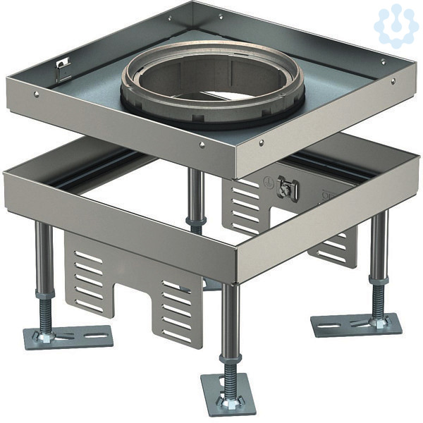Nivellierbare quadratische Kassette für Tubus der Nenngröße 4 für den Einbau von Installationsgeräten in Kanalsystemen, Doppel- und Hohlböden in trocken oder nass gepflegten Fußböden im Innenbereich.