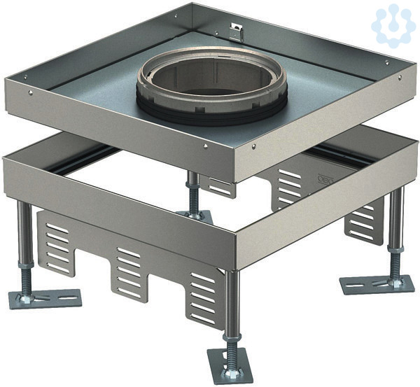 Nivellierbare quadratische Kassette für Tubus der Nenngröße 9 für den Einbau von Installationsgeräten in Kanalsystemen, Doppel- und Hohlböden in trocken oder nass gepflegten Fußböden im Innenbereich.