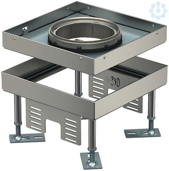 Nivellierbare quadratische Kassette Schwerlast für Tubus der Nenngröße 4 für den Einbau von Installationsgeräten in Kanalsystemen, Doppel- und Hohlböden in trocken oder nass gepflegten Fußböden im Innenbereich. Belastungsklasse 1 bis 10 kN.
