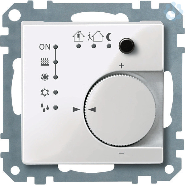 Im Design System M. Das Gerät ist ein Raumtemperaturregler und ein Binäreingang. In Abhängigkeit der Betriebsart, des aktuellen Temperatur-Sollwertes und der Raumtemperatur wird eine Stellgröße zur Heizungs- oder Kühlungssteuerung auf den KNX gesendet. Die Temperatur kann wahlweise durch den internen oder durch einen externen Temperaturfühler, der an der Klemmleiste der Tasterschnittstelle anzuschließen ist, erfasst . Die Tasterschnittstelle erzeugt intern eine Signalspannung zum Anschluss von max. vier konventionellen Tastern/potentialfreien Kontakten. Davon lassen sich zwei Eingänge zum Anschluss von Low Current-LEDs verwenden. Mit integriertem Busankoppler. Der Busanschluss erfolgt über eine Busanschlussklemme. Softwarefunktionen KNX: Funktionen Raumtemperaturregler: Reglertyp: 2-Punkt-Regelung, stetige PI-Regelung, schaltende PI-Regelung (PWM). Ausgang: Stetig im Bereich 0xx100% oder schaltend EIN/AUS. Regler-Mode: -Heizen mit einem Reglerausgang. Kühlen mit einem Reglerausgang. Heizen und Kühlen mit getr