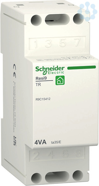 Resi9 Klingeltransformator iTR. Primärspannung 230V ±10 %, 50-60 Hz, Sekundärspannung 8-12V AC ±15 %, Leistung 4 VA. Klingeltransformatoren transformieren aus der Betriebsbemessungsspannung (230V AC) zu einer Kleinspannungen (8 V oder 12 V) auf der Sekundärseite. Breite 2 TE, Gewicht 374 Gramm, 89 mm (H) x 36 mm (B) x 60 mm (T). Anschlüsse 1 - 2,5 mm² starre oder flexible Anschleitung oder mit Aderendhülse. folgende Norm erfüllt der Klingeltransformator IEC EN 61558-2-8.