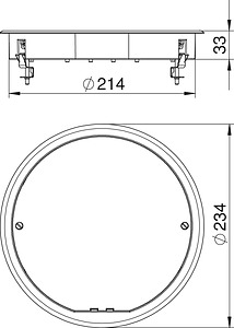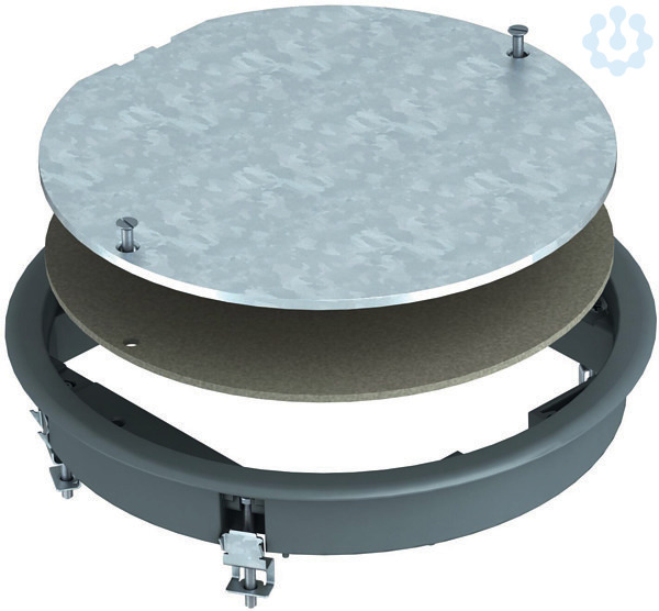 Zugdoseneinsatz zum Blindverschluss einer runden Montageöffnung der Nenngröße R4 mit Universalbefestigungswinkel. Teppichschutzrahmen aus Polyamid. Bodenbelagstärke max. 5 mm.