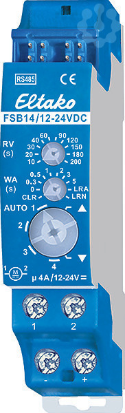 Schaltaktor Beschattungselemente und Rollladen für einen 12-24V DC-Motor. 1+1 Schließer 4A/12-24V DC, potenzialgetrennt von der Versorgungsspannung 12V. Bidirektional. Stand-by-Verlust nur 0,1 Watt. Reiheneinbaugerät für Montage auf Tragschiene DIN-EN 60715 TH35. 1 Teilungseinheit = 18mm breit, 58mm tief. Anschluss an den Eltako-RS485-Bus. Querverdrahtung Bus und Stromversorgung mit Steckbrücke. Die DC-Spannung für den Motor wird an die Klemmen - und + angeschlossen, der DC-Motor an die Klemmen 1 und 2. Sind Relais des FSB14 eingeschaltet, werden 0,4 Watt benötigt. Beim Ausfall der Versorgungsspannung wird definiert ausgeschaltet. Die Taster können entweder als Richtungstaster oder als Universaltaster eingelernt werden: Örtliche Steuerung mit Universaltaster: Mit jedem Tastimpuls wechselt die Schaltstellung in der Reihenfolge Auf, Halt, Ab, Halt. Örtliche Steuerung mit Richtungstaster: Mit einem Tastimpuls oben wird die Schaltstellung Auf gezielt aktiviert. Mit einem Tastimpuls unten wird die Schaltstellung A