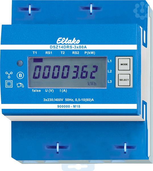 Nur geeichte Zähler sind nach Paragraph 25 des deutschen Eichgesetzes zur Stromabrechnung zugelassen. Nichtbeachtung ist eine Ordnungswidrigkeit nach Paragraph 19. RS485-Bus-Funk-Drehstromzähler. Maximalstrom 3x80A, Stand-by-Verlust nur 0,8 Watt an L1 und je 0,5W an L2 und L3. Genauigkeitsklasse B (1%). Mit RS485-Schnittstelle. Der direkt messende Drehstromzähler misst die Wirkenergie anhand der zwischen den Eingängen und Ausgängen fließenden Ströme. Der Eigenverbrauch von nur maximal 0,8 Watt bzw. 0,5W Wirkleistung je Pfad wird nicht gemessen und nicht angezeigt. Es können 1, 2 oder 3 Außenleiter mit Strömen bis zu 80A angeschlossen werden. Der Anlaufstrom ist 4OmA. Die Anschlüsse L1 und N müssen vorhanden sein. Anschluss über ein FBA14 an den Eltako-RS485-Bus mit einer 2-adrigen geschirmten Busleitung (z.B. Telefonleitung). Der Zählerstand und die Momentanleistung werden dem Bus übergeben - z.B. zur Weitergabe an einen externen Rechner oder die GFVS 3.0 Software - und auch über das FAM14 in das Funknetz ges