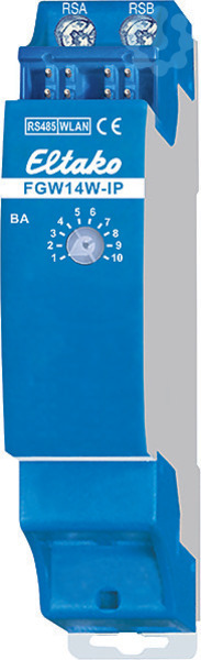 Gateway mit IP-Schnittstelle für Baureihe 14-Stromzähler über WLAN. Stand-by-Verlust nur 0,8 Watt. Reiheneinbaugerät für Montage auf Tragschiene DIN-EN 60715 TH35. 1 Teilungseinheit = 18mm breit, 58mm tief. Das Gateway ist nur 1 TE breit: Für den Betrieb muss das Gateway in ein WLAN eingebunden werden. Die WLAN-Verbindung nutzt das 2.4 GHz Frequenzband. Anschluss an den Eltako-RS485-Bus. Querverdrahtung Bus und Stromversorgung mit Steckbrücke. Betrieb in Verbindung mit FAM14 oder FTS14KS. Die Hold-Klemme wird mit dem FAM14 oder FTS14KS verbunden. Die IP-Verbindung erfolgt über WLAN. Das Gateway überträgt Daten von beliebigen Eltako-Stromzählern am RS485-Bus über das MQTT-Protokoll. Die Daten werden vom RS485-Bus an einen beliebigen externen MQTT-Broker übertragen. Für mehr Details zu MQTT siehe: www