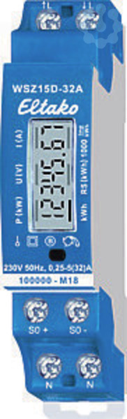 Maximalstrom 32 A, Stand-by-Verlust nur 0,4 Watt. Reiheneinbaugerät für Montage auf Tragschiene DIN-EN 60715 TH35. 1 Teilungseinheit = 18mm breit, 58mm tief. Anschluss an den Eltako-RS485-Bus. Querverdrahtung Bus und Stromversorgung mit Steckbrücke. Der Zählerstand, die Momentanleistung und die Seriennummer werden dem Bus übergeben ? z. B. zur Weitergabe an einen externen Rechner, an einen Controller ? und auch über das FAM14 in das Funknetz gesendet. Dazu ist es erforderlich, dass von dem Funk-Antennenmodul FAM14 eine Geräteadresse vergeben wird, wie in der Bedienungsanleitung beschrieben. Dieser Wechselstromzähler misst die Wirkenergie anhand des zwischen dem Eingang und dem Ausgang fließenden Stromes. Der Eigenverbrauch von nur maximal 0,4 Watt Wirkleistung wird nicht gemessen und nicht angezeigt. Es kann 1 Außenleiter mit einem Strom bis zu 32A angeschlossen werden. Der Anlaufstrom ist 20mA. Genauigkeitsklasse B (1%). Bei einer zu erwartenden Belastung von mehr als 50% ist ein Lüftungsabstand von 1/2 Teil