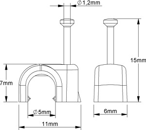 Rundschelle, mit vormontiertem Nagel, halogenfrei. Abmessungen (ca. Maße) H x B x L : 7 x 6 x 10,5 mm für Kabel-Ø