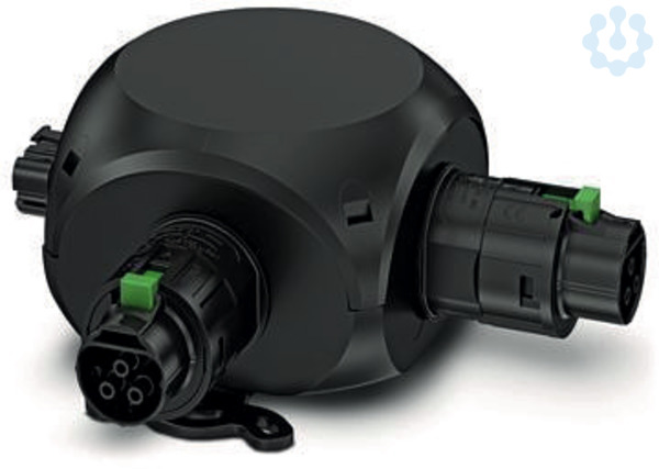 Rundsteckverbinder (kabelseitig), Artikelfamilie: PRC, Verteiler, Material Gehäuse: Polycarbonat faserverstärkt, Farbe: schwarz, Nennspannung: 400 V, Bemessungsstrom: 32 A, Anschlussart: vorkonfektioniert, Kontaktart: Eingang: Stift / Ausgänge: Buchse