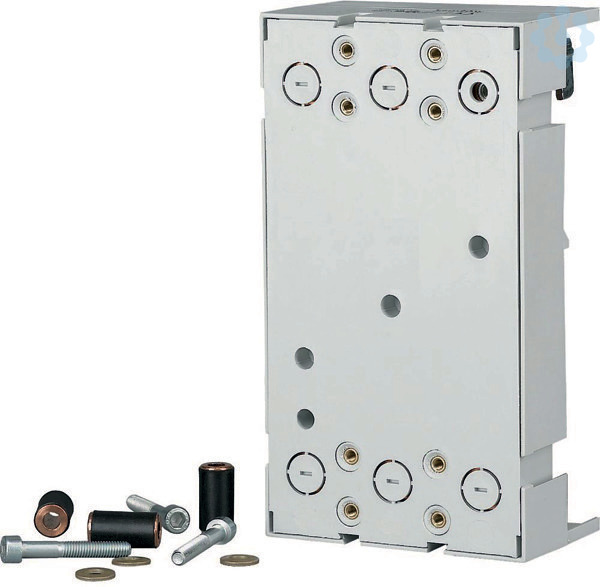Typgeprüfter Sammelschienenadapter für NZM Leistungsschalter und N Lasttrennschalter, zum Aufbau auf Cu-Flachschienen 12-30x5-10, Doppel-T- und Dreifach-T-Profil, Bemessungsbetriebsstrom Ie=250A, verwendbar für NZM2,, PN2,, N(S)2, Adapterbreite=106mm, Bemessungsbetriebsspannung Ue=690VAC, Schraubverbindung auf die Sammelschiene 5mm oder 10mm Dicke, Anschluss oben oder unten möglich, durch drehen des Adapters, Temperaturbeständig bis 120°C, selbstverlöschend nach UL 94, Kriechstromfestigkeit CTI 200, Polzahl=3-polig, Sammelschienenmittenabstand=60mm, verwendbar im Zusammenspiel mit Sammelschienen-System SASY 60i, UL approbiert