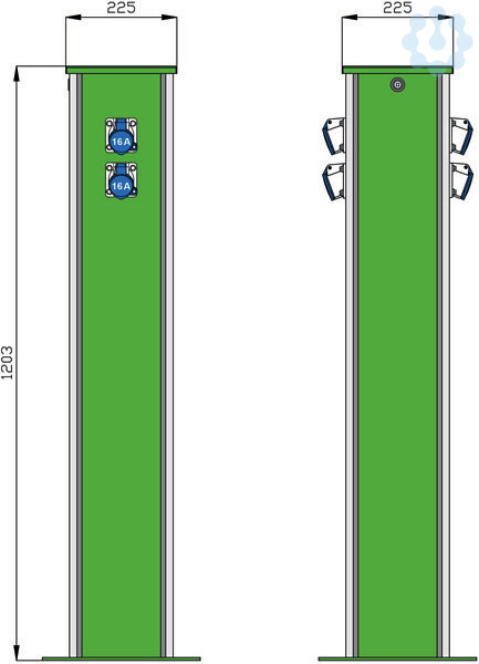 Gehäuse aus Aluminium mit 4 Eckprofilen Seitenteile aus V2A (Werkstoff 1.4301) mit Lackierung in RAL 7032 -grau- mit Bodenflanschplatte und Bohrungen zur Befestigung Schutzart: IP44 Größe ca.: 1200 x 225 x 225mm / H-B-T