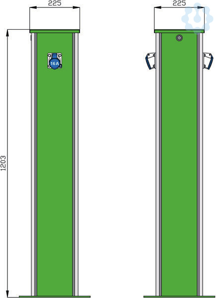 Gehäuse aus Aluminium mit 4 Eckprofilen Seitenteile aus V2A (Werkstoff 1.4301) mit Lackierung in RAL 7032 -grau- mit Bodenflanschplatte und Bohrungen zur Befestigung Schutzart: IP44 Größe ca.: 1200 x 225 x 225mm / H-B-T