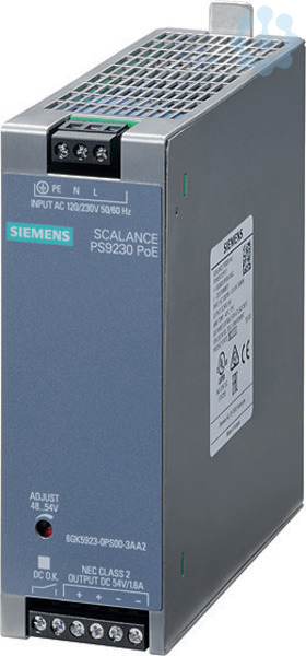 SCALANCE PS9230 PoE Power-Supply für Power-over-Ethernet, Eingang: AC 120/230 V, Ausgang: DC 54 V/1,6 A NEC Class 2 Stromversorgung SCALANCE PS924 PoEKonzipiert für den Einsatz im Schaltschrank (Schutzart IP20) zusammen mit Switches, in anspruchsvollen Umgebungen bei einem Betriebstemperaturbereich von -40 °C bis +70 °C.Hohe Leistung (bis zu 120 Watt) an den Switch-Ports für angebundene Power-over-Ethernet (PoE)-Teilnehmer möglich. Typische Teilnehmer, sogenannte Powered Devices (PD), sind z. B. WLAN Access Points, RFID Readers, Kameras, IP-Telefone etc. Vorteil von PoE: Reduzierter Verkabelungsaufwand durch die Nutzung der Datenleitung sowohl für die Übertragung von Daten als auch für die Versorgungsspannung des angeschlossenen Teilnehmers. Platzsparend durch kompakte Bauform und Montage auf der Hutschiene. Einfache Installation dank Klassifizierung als Stromquelle mit begrenzter Leistung (LPS / NEC Class 2). Robustes, industriegerechtes Gehäuse aus Metall für den Einsatz in klimatisch anspruchsvollen Umgebu