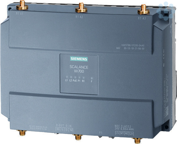 IWLAN Access Point, SCALANCE W788-2 RJ45, 2 Radios, 6 R-SMA Antennenanschlüsse, IEEE 802.11a/b/g/h/n, 2,4/5 GHz, brutto 450 Mbit/s pro Radio 1 x RF45 (max. 1 Gbit/s), POE 2 x DC 24V, IP30 (-20 bis + 60° C), WPA2/802.11I/e, Meldekontakt, Länderzulassung beachten! (Cert ID: RAPN-W2-RJ-E3) beinhaltet: MPCIE-R1-ABGN-U3 Lieferumfang: Handbücher auf CD, de/en 2 x Klemmblock, Nur zum Betrieb in Israel. SCALANCE W788-2 RJ45 (ISR) 2xRadios, 6xR-SMA-Antennenanschluss, iFeatures support via KEY-PLUG, IEEE 802.11a/b/g/h/n, 2,4/5 GHz, brutto 450 Mbit/s pro Radio, 1xRJ45 max. 1 Gbit/s, PoE, Redundant DC 24 V, Klemmblock, IP30, -20°C - +60°C, Plug-Schacht, nur zum Betrieb in Israel. Access Point für die drahtlosen Vor-Ort-Vernetzung von Anlagenteilen mit Bedarf an hohen Bandbreiten. 1 Stück.Access Point mit zwei eingebauten Funkinterface für den Aufbau von Funkverbindungen mit iFeatures (iPCF/iPCF-MC) über Wechselmedium (Plug). Die Geräte sind für den Einbau im Schaltschrank in industriellen Anlagen wie Einschienenhängebahn