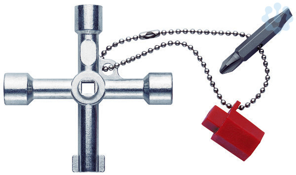 Mit Kette, Adapter und Wechselbit 1/4 Zoll, Innenvierkant 5,6 und 7-8 mm, Innendreikant 9 mm, Doppelbart 3 - 5 mm, Bit PH2 und Schlitz 1,2 x 0,7 mm, Heizungsentlüftungs-Schließung (5 mm Innenvierkant) in der Mittelnarbe.