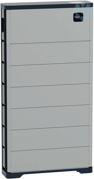 Schneider Boost Batterie Modul mit 20,4kWh Kapazität. Bestehend aus 6 x Schneider Boost Batterie Modul (BATB3KEU3) mit je 3,4kWh Kapazität und dem Schneider Boost Batterie Controller (BATPMEU2). Nutzbare Energie 18600Wh. Betriebstemperatur -25 bis 55°C, Abmessungen BxHxT 799x1533x218 mm, Gewicht 196kg, Schutzgrad IP55. Normen: IEC 63056, IEC 62619, IEC 62477-1, EN 61000-1/3.