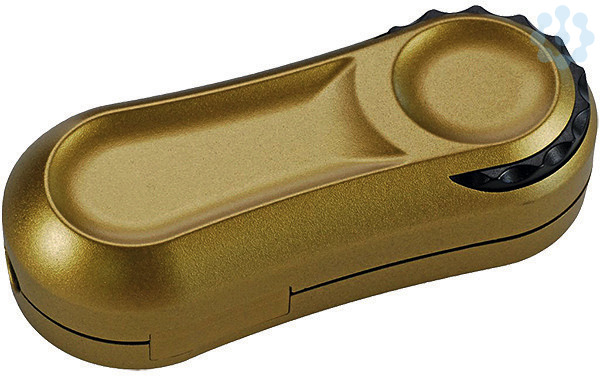 Schnur-Zwischendimmer Serie 8114. 250 V, 50 Hz, von 20 - 200 W/VA. Farbe: gold. Dreh-Ausfunktion. mit Schutzleiteranschluss. von außen zugänglicher Sicherungshalter. Maße: L/B/H 96 x 41 x 29mm