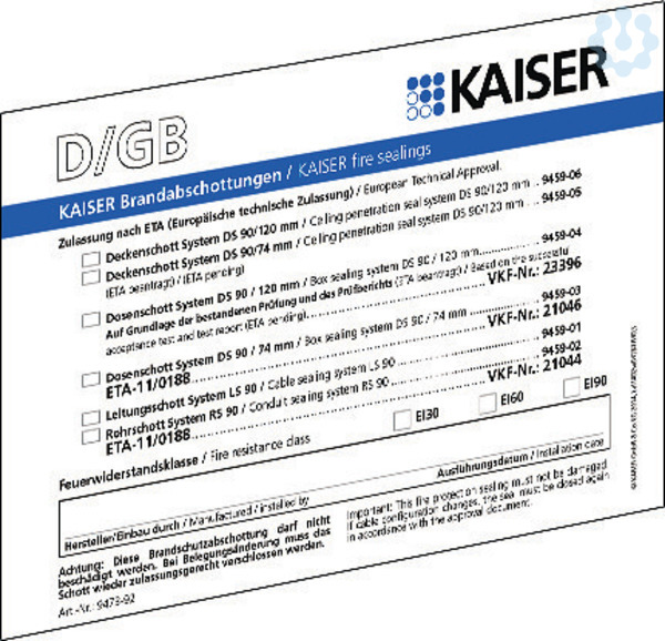 Brandschutz Schott-Kennzeichnungsschild, Sprachen D/GB/FR/NL, für alle KAISER-Schottungen