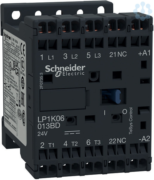 Leistungsschütz TeSys LP1K. 3 polig, 3 Schließer. Zusätzliche Hilfskontakte- 1 Öffner, Bemessungsbetriebsleistung bei AC-3, 400 V 5.5 kW, Bemessungsbetriebsstrom Ie bei AC-3, 400 V 12 A, Spule 24 V DC. Abmessung (BxHxT) 45x58x57 mm, Gewicht 0,225 kg. Kategorie AC-1, AC-4, AC-3. integrierte bidirektionale Amplitudenbegrenzerdiode. Einfache Maschinensteuerung in Industrie, Infrastruktur und Gebäudeanwendungen. Einfach zu bedienende Schnittstelle für elektronische Geräte (SPS). Zertifizierungen nach UL, CSA. Produktstandards gem.