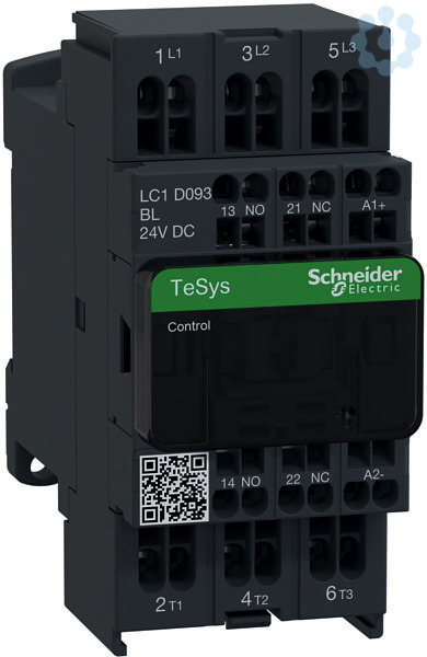 Leistungsschütz TeSys LC1D. 3 polig, 3 Schließer. Zusätzliche Hilfskontakte- 1 Schließer + 1 Öffner, Bemessungsbetriebsleistung bei AC-3, 400 V 4 kW, Bemessungsbetriebsstrom Ie bei AC-3, 400 V 9 A, Spule 24 V DC. Abmessung (BxHxT) 45x80x95 mm, Gewicht 0,48 kg. Kategorie AC-1, AC-3, AC-4. integrierte bidirektionale Amplitudenbegrenzerdiode. Schnelle und einfache Einrichtung. Sichere und langlebige Stromverbindung mit Everlink und Federklemmen. Geeignet für Sicherheitsanwendungen durch mechanisch gekoppelte Kontakte und Spiegelkontakte. Zertifizierungen nach UL, GOST, CSA, CCC, GL, BV, LROS (Lloyds register of shipping), DNV, RINA. Produktstandards gem.