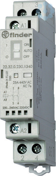 Installationsschütz für 35 mm-Schiene, 2 Schließer für 25 A / 250 V AC, Kontaktmaterial AgNi, max. Schaltleistungen bei 230 V AC: AC1 6250 VA, AC15 1800 VA, 1-Phasen-Motorlast, AC3 (230 V AC) 1 kW, Energiesparlampen 100 W, LED (230 V AC) 100 W, NV-Halogenlampen oder LED mit EVG 100 W, NV-Halogenlampen oder LED mit KVG 300 W. Spule: 230 V AC/DC, Breite 17,5 mm, mit On-Auto-Off - Schalter, LED und mechanischer Schaltstellungsanzeige, Relaisschutzart: IP 20