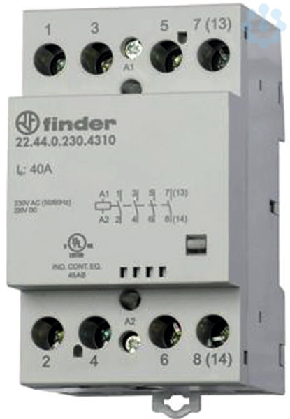 Installationsschütz für 35 mm-Schiene, 1 Öffner und 3 Schließer für 40 A / 440 V AC, Kontaktmaterial AgSnO², max. Einschaltstrom 176 A - 5 ms, max. Schaltleistungen bei 230 V AC: AC1-AC-7a: 16 kVA, Bemessungsstrom AC3-AC7b 22 A, Glüh- und Halogenlampen 4000 W, Leuchtstofflampen mit EVG 1500 W, Leuchtstofflampen unkompensiert 1500 W, Energiesparlampen 1000 W, LED (230 V AC) 1000 W, NV-Halogenlampen oder LED mit EVG 1000 W, NV-Halogenlampen oder LED mit KVG 1500 W, Spule: 230 V AC/DC, Breite 53,5 mm, mechanische Schaltstellungsanzeige, Relaisschutzart: IP 20