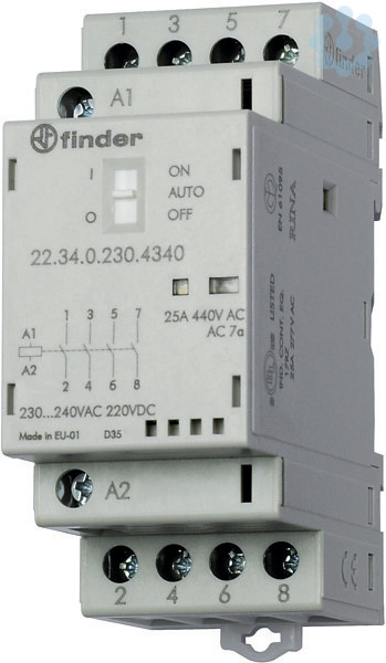 Installationsschütz für 35 mm-Schiene, 4 Schließer für 25 A / 250 V AC, Kontaktmaterial AgSnO², max. Schaltleistungen bei 230 V AC: AC1 6250 VA, AC15 1800 VA, 3-Phasen-Motorlast, AC3 (400-440 V AC) 4 kW, Bemessungsstrom AC AC-7c 10 A, Glüh- und Halogenlampen 2000 W, Kompaktleuchtstofflampe (Energiesparlampe) 200 W, Leuchtstofflampe mit EVG 800 W, Leuchtstofflampe mit KVG 500 W, LED (230 V AC) 200 W, NV-Halogenlampen oder LED mit EVG 200 W, NV-Halogenlampen oder LED mit KVG 800 W. Spule: 12 V AC/DC, Breite 35 mm, mit On-Auto-Off - Schalter, LED und mechanischer Schaltstellungsanzeige, Relaisschutzart: IP 20