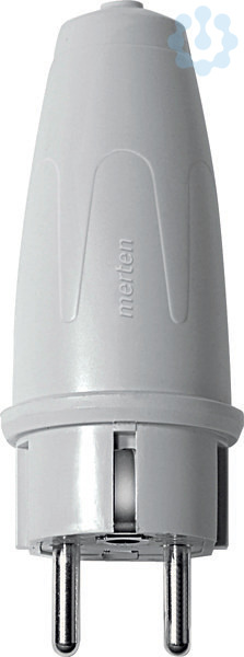 Mit deutschem und französisch/belgischem Schutzkontakt. Spritzwassergeschützt. Große Ausführung, mit Knickschutztülle. Farbe grau.