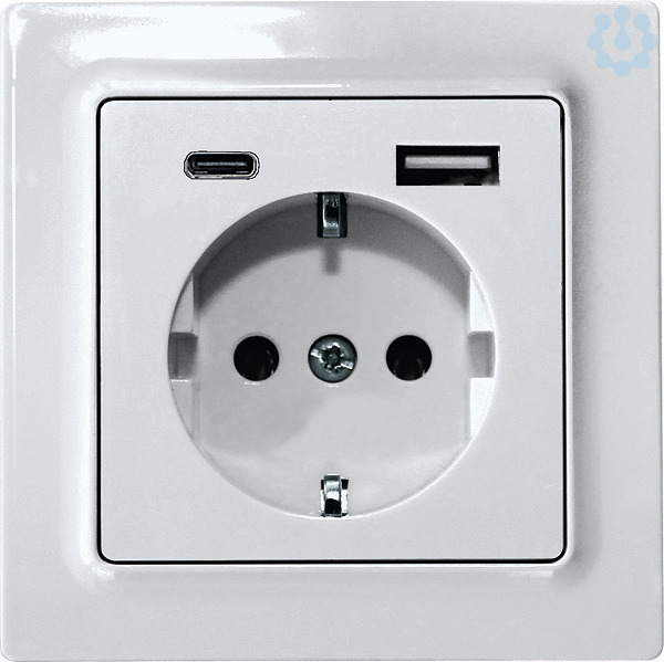 Deutsche Schutzkontakt-Steckdose DSS mit Steckdosen-Oberteil und USB-Adapter im E-Design55, 80x80mm außen, Rahmen-Innenmaß 55x55mm. Reinweiß glänzend. Mit erhöhtem Berührungsschutz. Das Steckdosenunterteil hat Schraubklemmen. Einbautiefe 38mm. Integriertes USB-Netzteil 5V DC/2,8A mit Kurzschluss- und Überlastschutz. Intelligente Parallelnutzung beider USB-Anschlüsse.
