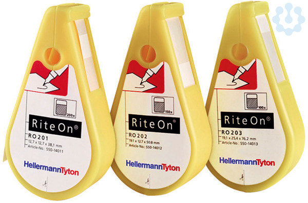 Praktischer RiteOn-Etikettenspender für die manuelle Beschriftung. Ideal für Reparatur- und Wartungsarbeiten bei kleinen Volumen. Einfaches Beschriften und Verarbeiten der Etiketten. Hervorragender Schutz gegenüber Feuchtigkeit und mechanischem Abrieb durch das Schutzlaminat. Markierstift T82 für professionelle und dauerhafte Handbeschriftung. Beschreiben der Etiketten im Sichtfenster des Dispensers und anschließendes Applizieren. Nachfüllpackungen erhältlich (REF). RiteOn Starter Pack Dieses praktische Set ist die ideale Lösung, wenn Sie Kabel und Leitungen manuell kennzeichnen wollen. Nachfüll-PackungenDie Nachfüllpackungen für die RiteOn Dispenser sind in 3 Größen und 6 unterschiedlichen Farben erhältlich. Bereits vorhandene Dispenser können so einfach und schnell neu bestückt werden.Markierstifte T82 Die Markierstifte T82S-BK und T82R-RD sind für die dauerhafte Kennzeichnung manuell beschriftbarer Etiketten besonders geeignet. Die Tinte ist extrem schnell trocknend und in hohem Maß UV-beständig. Erhältlic